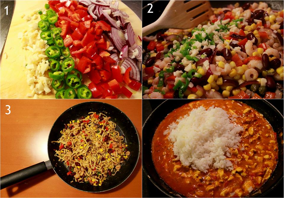 Alla lisää mun tekeleitä, muunmuassa papu-katkarapuwokkia vihreällä chilillä ja inkivääri-curry-kanakastike basmatiriisillä.